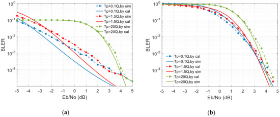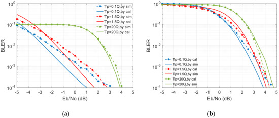 Figure 13 shows the simulated results of a rate-2/3 turbo code with 16QAM radio signal in the case of ρ = 0.1 and ρ = 0.9, respectively, and Figure 14 shows the simulated results of LDPC code. From Figure 13a, although the interferences of different repetition cycles have the same APD when SNRh = 2 dB, the difference between their BLER is as large as almost two orders of magnitude. Therefore, a single APD parameter is not sufficient to evaluate the performance accurately, and may result in considerable errors. In addition, comparing Figure 13a,b, we can see that the smaller the duty ratio is, the larger error the APD method leads to, which is caused by the assumption of a uniform distribution of errors within a code word.