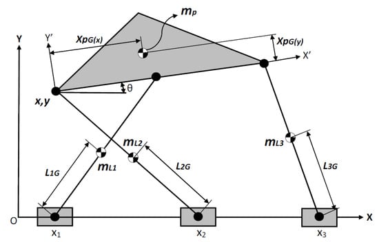 A general rigid body typically has ten barycentric parameters, which include a mass, three first moments of inertia, and six elements of the inertia matrix. If the inertia matrix is evaluated with respect to the principal axes of the body, all the off-diagonal elements vanish to zero, i.e., the inertia matrix becomes a diagonal matrix. In such a case, only three elements of the inertia matrix should be defined. In a planar mechanism in which only rotation about the Z-axis is available, only the inertia elements related to the Z-axis are retained. Accordingly, when a planar mechanism is considered and the inertia matrix is evaluated with respect to the principal axis, which is the case for the mechanism at hand, the inertia matrix turns into a single scalar inertia. For this reason, the moment of inertia of each of the legs and the moving platform of the mechanism at hand is defined by a single scalar.