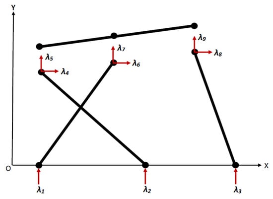Among the nine Lagrange multipliers in Equation (18), six multipliers correspond to the internal reaction forces in