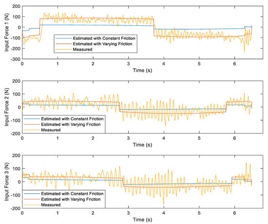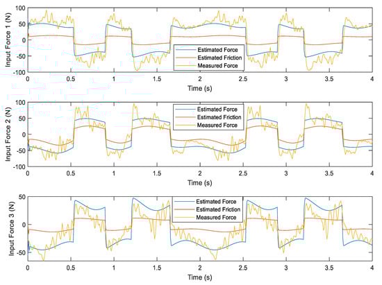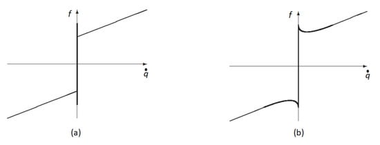 fv denote diagonal matrices containing the static, Coulomb, and viscous friction parameters, respectively. For the case of a nonzero velocity in Equation (23), the first and the third terms in the right-hand side are the Coulomb and viscous friction components, whereas the second term is the Stribeck-effect friction component. Furthermore, some values of