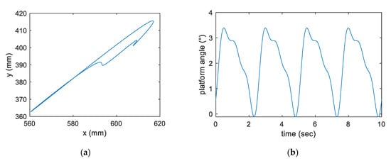 yp denotes the altitude of the COM of the moving platform relative to the datum. The potential energy expressions in Equations (7) and (8) hold when the mechanism is standing vertically, as described earlier. When the mechanism is oriented on a horizontal plane such that all of the COMs have an identical altitude in the direction of gravity, the equations are no longer valid. In such a case, when the datum of the potential energy evaluation has an identical altitude to all of the COMs, then the potential energy due to gravity vanishes. In this case, the rigid body motion of the mechanism is not affected by gravity. A practical way to suppress the effect of gravity in a general model is by imposing a zero value to the gravitational acceleration constant