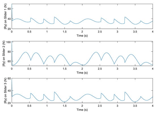 Although the weight of the prismatic joint, i.e., the first term on the right-hand side of Equation (25), is constant, the force component Ryi varies in general, depending on the mechanism posture. As a result, the normal force fn, and accordingly the static and Coulomb friction parameters, fs and fc, are not constant.