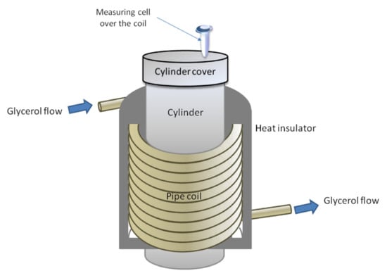 A KAN-therm PE-RT/AL/PE-RT pipe (KAN-therm, Poland) fabricated from armed polyethylene was used as a communication pipe. This pipe was fabricated from a more durable material than silicone (used in our previous study [16]) and hence could be successfully used in experiments with warm glycerol, as glycerol is a much more viscous liquid. The pipe coil’s dimensions were as follows: a coil diameter of 25 cm, a coil height of 40 cm, and an inner diameter of the pipe of 1.5 cm. To provide sufficient intensity of the glycerol flow through the pipe, the glycerol in the flow-based system was warmed to 65 °C to provide better flowability [49]. At the same time, the coiled pipe was covered with a thermal shield (a layer of metallized, foamed polypropylene) to avoid undesired heating of the measuring cell with the test protein solution, whose temperature remained unchanged and was maintained at a level of 23 °C. To supply glycerol into the flow-based system, a BE-G 20 HP0.8 gear pump was employed. The volumetric flow rate of glycerol was 8.7 L/min.