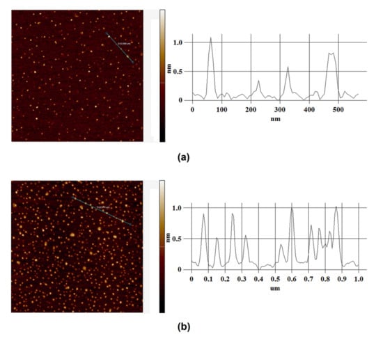 Figure 2 displays typical AFM images of the mica surface with HRP macromolecules adsorbed from the tested solutions, and corresponding cross section profiles indicated by the blue lines in the images. Figure 3 displays the density function plots of the distribution of the imaged objects with height ρ(h) and the number of visualized particles normalized per 400 µm2 area plotted, based on AFM data summarized for each sample.