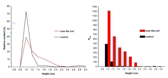 Figure 3 (right panel) shows absolute numbers of objects (N400) adsorbed on the mica surface. As seen from the distribution plot in Figure 3, an increase in the number of adsorbed objects was observed for the sample incubated in the experimental setup. That is, the number of objects adsorbed on a 400 µm2 area amounted to 3014, while in the control experiment this number was only 676.