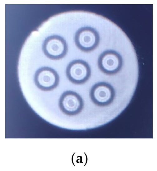 A photo of an MCF (Yangtze Optical Fibre and Cable Joint Stock Limited Company (YOFC), Wuhan, Hubei, China) cross-section captured by a fusion splicer (Fujikura, Tokyo, Japan) and the schematic structure of the MCF probe are shown in Figure 2. The MCF has one centric core and six side cores. Six side cores are distributed in a regular hexagon around the centric core. The diameter of each core is 8 μm. The adjacent core–core distance is 41.5 μm. The diameter of the cladding is 150 μm. The cores are enclosed by a deep trench so that crosstalk is suppressed. We set a 2D co-ordinate system that has three axes (a-axis, b-axis and c-axis) at the probe end as shown in Figure 3. The angle between adjacent axes is 60 degrees. The seven cores are distributed in the co-ordinate system.