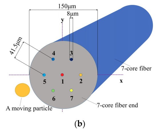 (a) Photo of multicore fiber (MCF) cross-section; (b) schematic structure of 7-core fiber probe with a moving particle.