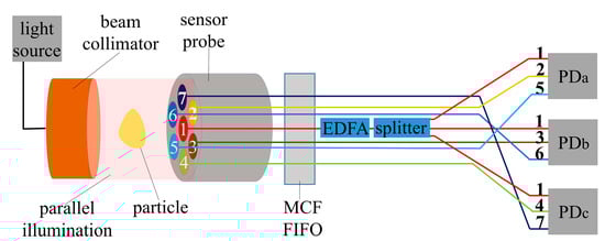 The experimental setup for 2D particle velocity measurement by using MCF is shown in Figure 4. A broadband light source of an amplified spontaneous emission (ASE) with an output power of 2.3 mW and a central wavelength of 1550 nm is connected to a beam collimator, which provides the parallel illumination. The MCF is divided into seven separate cores by the MCF FIFO (fan in fan out) module. The 1st core is connected to an erbium doped fiber amplifier (EDFA) and a 1 × 3 splitter. The splitter divides the output of the EDFA into three paths, each path connecting to a different photo detector (PD). The 1st, 2nd and 5th cores are connected to PDa. The 1st, 3rd and 6th cores are connected to PDb. The 1st, 4th and 7th cores are connected to PDc. The above connection method among different cores and PDs turns the MCF into three spatial filters for velocity components measurement as described in Figure 3.