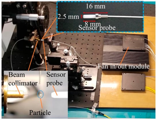 A natural non-spherical sand particle (the widest part of the particle is 100 μm, and the narrowest part is 70 μm; its main mineral component is SiO2) moves with velocity V between the sensor probe and the beam collimator. The particle is stuck to a needle, which is adhered to a rotating disk driven by an electric motor. Since the particle blocks the light when it passes through the fiber end, the sensor probe will receive a shadow image signal of the particle. Note that the parallel illumination is projected to the moving particle; this shadow image is as big as the particle, which means the image magnification m equals 1. That signal is divided by the MCF FIFO module and transmitted into seven cores. The output signals of the 1st core are shared by the three spatial filters. The power amplification in each filter is utilized to compensate the power loss during the splitting. After that, the light signals in different cores are received by PDa, PDb and PDc as shown in Figure 4. The photo of the major part of experimental setup is shown in Figure 5.