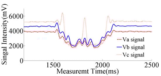 An example of the PDs’ output signals is illustrated in Figure 6, where the Va signal, Vb signal and Vc signal are outputs of PDa, PDb and PDc, respectively. We can see that when there is no particle passing through the sensor probe, the signals received by each PD are almost unchanged. Once a particle passes through the sensor probe in the direction at the angle α = 30°, some light is blocked by the particle so that the signals received by PDs are fluctuated. Note that as EDFA is used, signals are strengthened. The particle velocity and its direction can be acquired from two of the three velocity components. In practice, which signals will be chosen for velocity calculation is up to the signal quality, so here we only focus on the signals of Va and Vb.