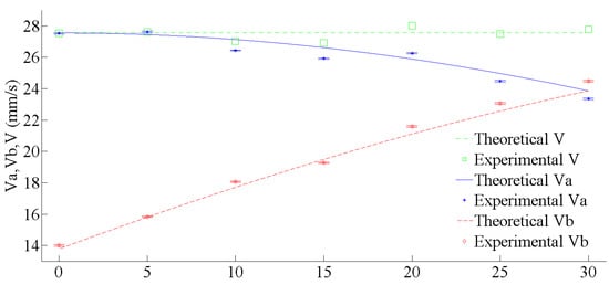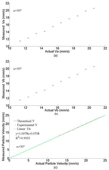 Measured Va and Vb with error bars at different actual velocities of the moving particle are shown in Figure 8a,b. Error bars were calculated by standard deviation and are based on three repeated measurements of each velocity component. According to the measured Va and Vb, the measured particle velocity V can be calculated by Equations (1) and (2). Figure 8c shows the measured velocity and actual velocity of the moving particle. The measured velocity is consistent with actual velocity within an error of 2%.
