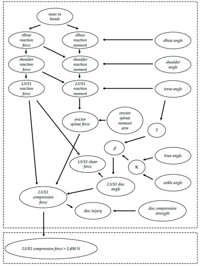 - Represent model as a directed acyclic graph. Nodes (written in italics) were made for input variables (mass in hands and body angles), joint reaction forces and moments, included knee angle, L5/S1 intervertebral disc angle, and erector spinae force. Directed edges were added to indicate relationships between forces and moments at ends of body segments, static equilibrium at the L5/S1 intervertebral disc, the regression equation relating included knee angle and torso angle to L5/S1 disc angle, and the trigonometry required to decompose the L5/S1 reaction force into L5/S1 shear force and L5/S1 compression force components. The disc injury portion of the model was completed by adding directed edges from the L5/S1 compression force and disc compression strength to disc injury nodes.
