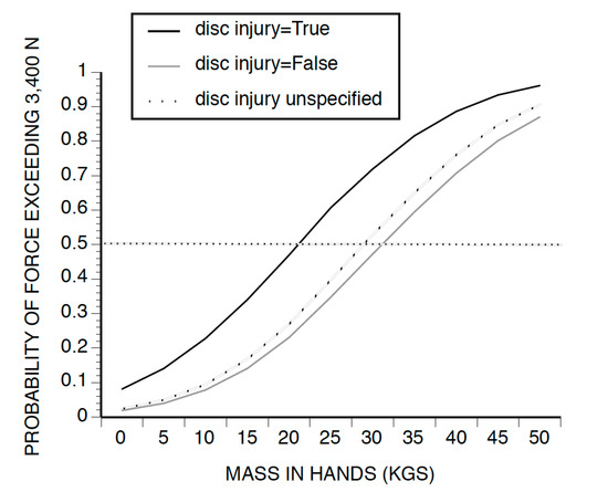 Including injury status in the hybrid Bayesian network analysis strongly affected the probability of L5/S1 spinal compression force exceeding 3400 N (Figure 3). Although the largest difference in probability predictions was between the disc injury node states of true and false, the most relevant comparison is between the disc injury unspecified and true states because this represented the comparison between what a traditional analysis would produce and an analysis that incorporated information about the injury status of the plaintiff. At a hand load of 25 kg, for example, the probability of exceeding 3400 N would be 0.40 and 0.61 for the unspecified and true disc injury conditions, respectively. The former value of 0.40 meant that it was less likely than not that the force threshold was exceeded; the probability of 0.61 indicated it was more likely than not. Thus, there was a region of hand loads that lead to two different opinions depending on the disc injury status. However, there were also levels of hand load that produced consistent results for all three disc injury conditions. The probability of exceeding the threshold was less than 0.5 for all disc injury states (true, false, and unspecified) below a hand load of 20 kg; similarly, above 35 kg, both disc injury states produced probability estimates greater than 0.5 for all conditions.