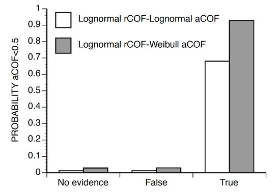 Probability of the ACOF being less than 0.5 when three difference levels of evidence (no evidence, true, and false) were entered at the slip node.