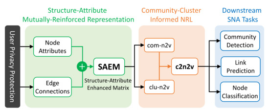 We first present the flowchart overview of the proposed model, as shown in Figure 1. The method consists of three phases. Given a social network, whose node attributes and edge connections are under user privacy protection (i.e., hide some information), we first perform structure-attribute mutually-reinforced representation. The goal is to create a structure-attribute enhanced matrix that mutually utilizes attributes and connections to alleviate each other’s data sparsity. Subsequently, the second phase is the proposed community-cluster informed NRL. It takes SAEM as input, and enforces NRL to be aware of topology-based communities and attribute-based clusters to further improve the quality of node embeddings. The last phase is to leverage the derived node embeddings for three downstream tasks on social network analysis, including community detection, link prediction, and node classification.