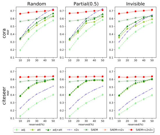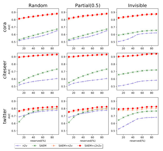 Node Classification. The results are exhibited in Figure 4. Our SAEM-based NRL models again outperform the other competing methods. SAEM itself can be seen as an effective feature representation, especially when users protect more privacy (i.e., lower “reserved (%)”). Nevertheless, the superiority gaps are not so significant as those on CD and LP tasks. The classifier is able to some extent distinguish different labels, so the negative effect of disconnected components is not strong.