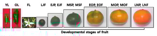 Citrus is one of the most important horticultural crops on Jeju Island of South Korea, and the satsuma mandarin Citrus unshiu is the most important cultivar. Of all the land on the island used for citrus cultivation in 2017, more than 80% was dedicated to C. unshiu (18,020 ha out of 20,333 ha). Citrus fruits are not only flavorful and attractive to consumers, but they are also a valuable component of a healthy human diet. Citrus fruits contain a variety of phytochemicals, including vitamins, carotenoids, phenolic compounds, coumarins, limonoids, pectins, and minerals that serve diverse roles in human health [1]. Numerous studies have established the anti-oxidant activity of phenolics and carotenoids in extracts from various citrus species and plant parts, specifically the peel and flesh of the fruit and rootstocks [2,3,4,5,6]. Phenolic compounds from citrus fruits are not only associated with anti-oxidant activity, but they have anti-inflammatory and anti-microbial activity as well. They may also reduce the risk of cancer, alcoholic liver disease, and cardiovascular disease [7,8,9]. In addition to the numerous beneficial effects of the anti-oxidant activity mentioned above, they may also have anti-aging activity. Several studies have reported on the anti-aging of medicinal plants, such as Crocus sativus [10], Rosmarinus Officinalis [11], Manilkara zapota [12], Coccinia grandis [13], and Cucumis sativas [14]. However, to our knowledge there is little information on the anti-aging effect in citrus fruits during developmental stages and on their association with anti-oxidant activity.