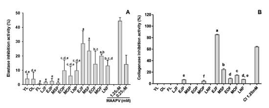 Anti-aging activity of tissues and fruit-maturity stages of C. unshiu. (A) Elastase inhibitory activity, (B) Collagenase inhibitory activity. Data are expressed as mean ± SD (n = 3), and different small letters indicate a significant difference by Duncan’s test; p < 0.05.