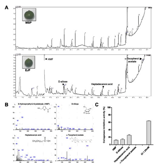 We found that the EJF extract has the most elastase and collagenase inhibitory activity. A GC-MS analysis carried out to know which chemical compositions are involved in the elastase/collagenase inhibition from the EJF extract. In addition, the MSP extract, which showed no the inhibition activity, was used in the GC-MS analysis to be compared with the EJF extract. A total of 46 and 33 compounds were detected from the EJF and the MSP extracts, respectively (Figure 3A, Tables S1 and S2), and we subtracted the chemical compounds detected in both extracts. After this, from the remaining chemical compounds in the EJF extract, four candidate compounds related to anti-aging and anti-oxidant activity through previous literature search were selected as follows: 5-hydroxymethyl-2-furaldehyde (HMF, 26.67%), D-allose (2.77%), heptadecanoic acid (0.69), and α-tocopherol acetate (0.1%) (Figure 3B, Tables S1 and S2). Investigating which of these candidate substances has an anti-aging effect was performed through the collagenase inhibition assay (Figure 3C). The collagenase inhibitory activity was highest in heptadecanoic acid (25.6%), followed by D-allose (14.2%) and HMF (12.2%), but α-tocopherol acetate showed no inhibitory activity.