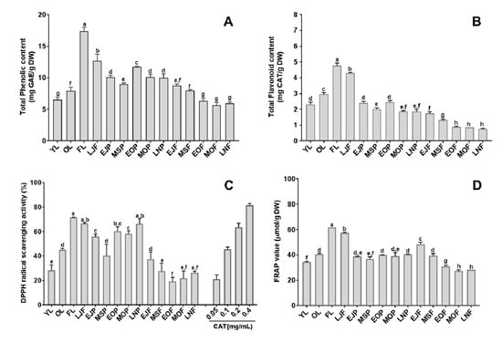 Total phenolic content (TPC), total flavonoid content (TFC), and anti-oxidant activity of tissues and fruit-maturity stages of C. unshiu. (A) TPC, (B) TFC, (C) DPPH radical scavenging activity assay, with catechin (CAT) as a standard, (D) ferric reducing anti-oxidant power (FRAP) activity assay. Data are expressed as mean ± SD (n = 3), and different small letters indicate a significant difference by Duncan’s test; p < 0.05.