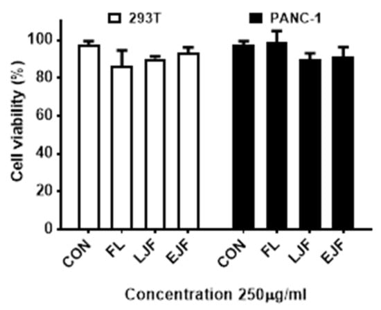 We wished to ensure that the extracts were not cytotoxic, since we anticipate that their anti-oxidant and anti-aging properties might be useful therapeutically. The cytotoxicity of the extracts was evaluated with the MTT assay using the 293T and PANC-1 cell line. We used extracts from flowers and immature fruits (LJF and EJF), which had high anti-oxidant and anti-aging activity. The cytotoxicity of the extracts was not significantly greater than the control (Figure 5). We conclude that citrus extracts can be used therapeutically for anti-oxidant and anti-aging purposes without cytotoxicity.