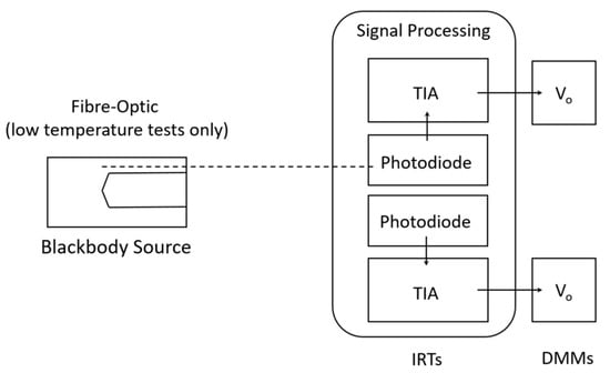 Typically, IRTs that use photodiodes also utilise a transimpedance amplifier (TIA) to provide a measurable voltage from the photocurrent generated. MWIR photodiodes generate small magnitude photocurrents when exposed to low radiant flux, which requires a high transimpedance to generate a measurable signal from the TIA. This dictates the need for op-amps with low noise and input voltage offset to be used in the TIA to afford the measurement of low temperatures with low uncertainty. Manufacturers offer ‘precision’ op-amps that have low magnitudes of input voltage offset, input current bias, noise and temperature-induced zero offset drift. Precision op-amps are often used in amplifier circuits to achieve precision measurements from low magnitude signals [9,10,11]. Similarly, low magnitude voltages to those arising from MWIR photodiodes but arising from physiological, micro-electro-mechanical-systems (MEMS) sensors and thermal detectors, have been demonstrated to be measurable using high gain amplifiers that had low noise and offset [5,12,13,14,15,16].