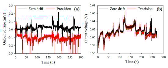 The variances for the zero-drift IRT can be seen to be smaller than the variances incurred by the precision IRT; these variances were calculated to be 8.6 × 10−4 (mV)2 and 19.1 × 10−4 (mV)2, respectively, therefore representing over 50% reduction in voltage noise. It was also evident by inspection of Figure 2a that the zero-drift IRT maintained the nominal ‘zero’ output voltage closer to zero millivolts than the precision IRT. The mean output voltages were +0.024 mV and −0.10 mV, respectively, therefore representing a 75% reduction in offset voltage. The precision IRT incurred a larger magnitude drift from zero-than the zero-drift IRT; the drift and cycling incurred by the precision op-amp IRT mostly occurred within the range −0.05 mV to −0.10 mV during the blanking tests. In comparison, the zero-drift IRT incurred variations mostly between 0.00 mV and +0.05 mV. Both IRTs demonstrated some larger excursions that occurred randomly during the tests, although the precision IRT incurred more excursions than the zero-drift IRT. It is believed that these excursions were caused by external interference sources, suggesting that the zero-drift IRT was more robust against EMC related pickup. Both IRTs demonstrated larger magnitude changes in the output voltage than the noise incurred around the mean values. These had similar magnitudes and occurred concurrently during the steady-state 700 °C set-point temperature tests, as illustrated by inspection of Figure 2b. The similarity of magnitude and occurrence of these output voltage changes for both IRTs implied that the cause was common. The upwards and downwards trend observed in the output voltage of both IRTs is believed to be due to the red-shift in the cut-off wavelength of the photodiodes. This shift occurs due to drift in the ambient temperature, which is identical for each IRT.