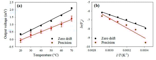 (a) Output voltage as a function of blackbody temperature for zero-drift and precision IRTs. (b) ln(Vo) as a function of 1/T for zero-drift and precision IRTs.