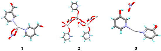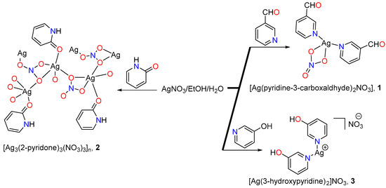 All silver(I) complexes were synthesized by employing a self-assembly approach. To a solution of AgNO3 (0.17 g, 1.0 mmol) in H2O (10 Ml, deionized), then, an ethanolic solution of pyridine-3-carboxaldhyde (0.19 mL, ~2.0 mmol), 2-pyridone (0.095 g, 1.0 mmol) or 3-hydroxypyridine (0.19 g, 2.0 mmol) added drop by drop with stirring. The solution was kept at ambient for few days to give colorless crystals of the target complexes. The crystals were filtered off, washed with small amount of ethanol, and dried in air. FTIR and NMR spectra of the three complexes are given in Figures S1 and Figure S2 (Supplementary data), respectively.