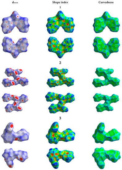 The π-π stacking interactions are another interesting feature of molecular packing that was observed using Hirshfeld surface analysis. It is clear from Figure 9 that all evidences for the π-π contacts such as red spots in dnorm and blue/red triangles in the shape index map were achieved. In addition, there is appropriate amount of C…C contacts in the three complexes as indicated from the fingerprint plot. The C…C contact percentages are 6.4, 2.8, and 2.6% for complexes 1–3, respectively.