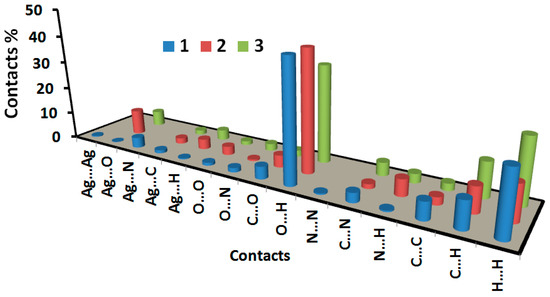 The different Hirshfeld surfaces of the three complexes are collected in Figure 6. In the studied Ag(I) complexes, the molecules are packed differently in the crystal structure and the possible contacts are presented in Figure 7.