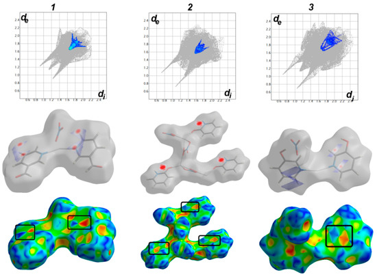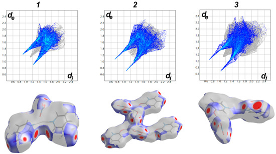 It is clear from Figure 7 that the O…H interactions contributed heavily in the molecular packing of the three complexes. The parentages of the O…H interactions are 43.7, 43.8, and 35.6% for complexes 1–3, respectively. The decomposed dnorm maps and fingerprint plots shown in Figure 8 revealed the importance of these interactions in the molecular packing.