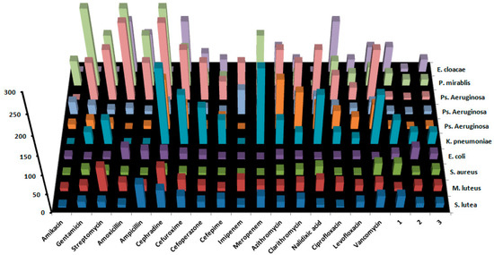 In this paper we introduced another group of silver(I) pyridine complexes with relatively high biological activity against a broad spectrum of MDR (multi drug resistance) and ATCC standard bacteria as well as the fungus C. albicans. The Minimum Inhibition Concentrations (MIC) of the tested compounds were tested and 17 antibiotics were used for the activity comparison. The detailed results are given in Table 2 and presented graphically in Figure 11. One of the advantages of this set of silver complexes is its broad-spectrum activity against MDR (multi drug resistance) bacteria isolated from diabetic foot ulcers as well as the ATCC standard bacteria with different action ranging from MIC = 4 μg/mL for compound 2 against Ps. Aeruginosa to MIC = 64 μg/mL for compound 1 against K. pneumoniae and E. Coli. An additional advantage of silver compounds is that they, in contrast with antibiotics in general, are active against fungi. Thus complexes 1–3 were active against the yeast C. albicans (See Table 2). When looking to these data, we also need to consider the different silver contents of the three compounds. These being by weight 28% for 1, 41% for 2 and 30% for 3. The best action is for 2 against Ps. Aeruginosa with MIC value of 4 μg/mL.