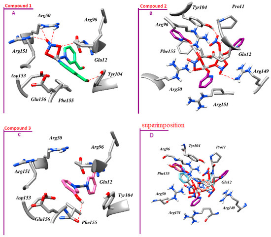 In contrast to complexes 1 and 2, complex 3 (Figure 12C) mainly stabilized by hydrophobic interactions with Glu12, Ala100, Tyr104, Phe155, and Glu156. Additionally, the contacts were further stabilized by hydrophilic interactions between Glu12 and Phe155 with 3-hydroxypyridine at a distance of 3.30 and 31.9 Å, respectively.