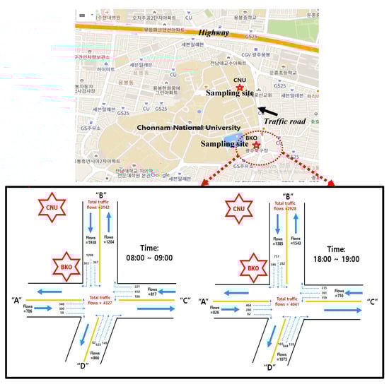 The two sampling locations (Buk-Ku District Office (BKO) and Chonnam National University campus (CNU)) and traffic volume around the BKO site.