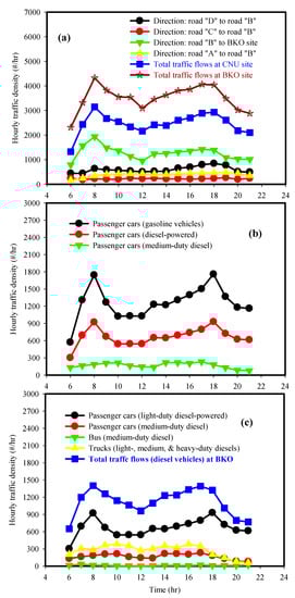 Figure 1 (lower part) shows the total traffic density around the BKO site at 08:00–09:00 and 18:00–19:00. The hourly traffic volume was investigated in October 2015 by Gwangju Metropolitan City [46]. The daily total traffic volume at the BKO site (# vehicles/day) was about 62,600. The hourly total traffic flow (# of vehicles/h) at the BKO site was 4327 at 08:00 and 4041 at 18:00. The CNU site had about 73% of the total traffic volume seen at the BKO site at the same times. Figure 2a illustrates the diurnal patterns of the total traffic density at the CNU and BKO sites. Additionally, the hourly traffic densities of passenger cars (gasoline vs. diesel) and diesel-powered vehicles at BKO are shown in Figure 2b,c. Light-duty gasoline and diesel-powered vehicles (<seven passengers) contributed 43% and 23% of the total traffic flow, respectively. Medium-duty diesel vehicles (with 8–15 passengers) and heavy-duty diesel buses accounted for 3.8% and 4.3% of the total flow. Diesel trucks, including light-duty (<2.5 tons), medium-duty (2.5–8.5 tons), and heavy-duty (>8.5 tons) trucks, accounted for 9.2% of the total vehicles. Altogether, the diesel-powered vehicles comprised approximately 40% of the total traffic flow.