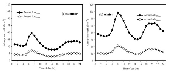Diurnal patterns of aerosol absorption coefficients at 370 and 880 nm during the summer and winter at CNU.