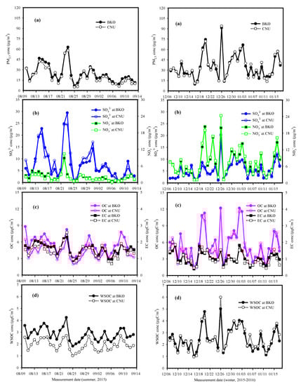 As shown in Table 1 and Figure 4, the OC concentration was higher in the winter than in the summer at both sites due to the increased consumption of fossil fuels for domestic heating and increased BB emissions. Slightly higher OC concentrations were observed at the BKO site, which is closer to the roadway, during both the summer and winter. However, comparable OC levels were observed at both the sites during winter. For the EC concentration, there was also little difference between the BKO and CNU sites during both seasons. Our measurements showed no notable increases in the concentrations of carbonaceous components strongly associated with traffic emissions at the site that was closer to the roadway. During the summer, the contribution of OM (organic mass, 1.8×OC) to the PM2.5 was approximately 6.0% higher at the BKO site (41.3%, 18.3–70.0%) than at the CNU site (34.5%, 14.1–66.7%), but EC had similar contributions at both sites (6.8% at CNU vs. 6.7% at BKO). The OM contributions during winter decreased due to an increased contribution of ∑SIS concentrations, especially NO3−. The average contributions of the OM concentration to the PM2.5 during the winter were 26.1% (16.6–37.3%) at CNU, and 28.3% (16.1–43.0%) at BKO. In this study, the OM concentration was calculated by multiplying the OC concentration by 1.8 in both the summer and winter. Generally, a conversion factor of 1.6 is applied in urban atmospheres [56]. However, an OM factor of 1.8 was used in this study to reflect the impact of the photochemistry in summer and the BB emissions in winter. The influence of the BB emissions on the chemical composition of aerosol particles is discussed below.