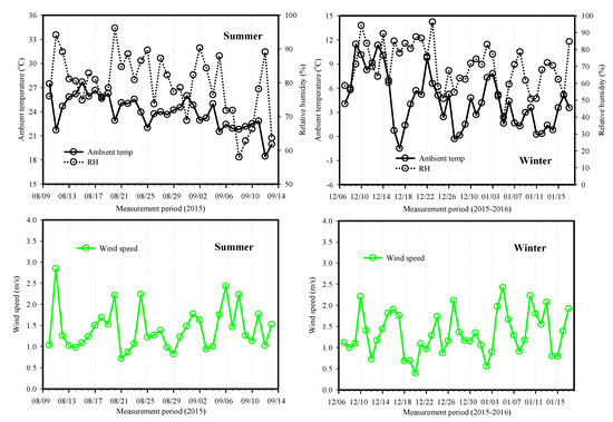 Temporal variations in the ambient temperature, relative humidity (RH), and wind speed during the summer and winter.