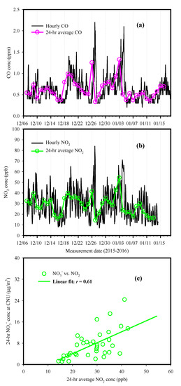 Temporal profiles of (a) CO and (b) NO2, and (c) the relationship between the 24 h averaged NO2 and NO3− concentrations during winter at the CNU site.