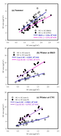 Figure 7 shows the relationships between the OC and EC concentrations at both sites during the summer and winter. During the summer, a regression analysis showed slopes of 3.3 and 2.4 and R2 values of 0.60 and 0.59 at the BKO and CNU sites, respectively. High R2 values (0.59–0.60) indicate that the OC and EC levels at both sites were associated with common sources—e.g., traffic emissions. It is not entirely clear, but the higher OC/EC slope at the BKO site was likely attributable to more enhanced SOA formation rather than additional primary sources of OC. During the winter, there were two distinct regression slopes between the OC and EC, but little difference in their slopes was found between the two sites. The winter period, representing the lower OC/EC slope, was classified as the case I period, and the higher slope was designated the case II period. For the case I period, lower slopes of 3.0–3.2 likely indicate the influence of traffic emissions on the OC and EC concentrations. On the other hand, the higher slopes of 6.6–6.7 for case II suggest the additional influence of BB emissions (e.g., wood burning) as well as traffic emissions and fossil fuel emissions for heating. In addition to traffic emissions, the influence of the other combustion emissions supports the comparable OC concentrations measured during the winter at the CNU and BKO sites.