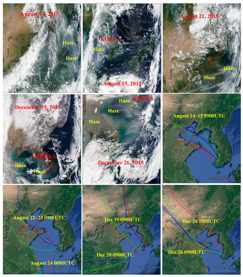 MODIS images and transport pathways of air masses arriving at the sampling site during the summer and winter pollution episodes. Red, blue, and green lines on air-parcel back-trajectories represent the pathways of air masses at heights of 500, 1000, and 1500 m AGL (above ground level).