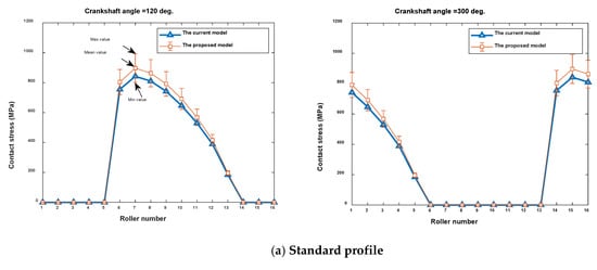 Figure 9 compares the contact stress values obtained by the current model and the proposed model for the cases of no modification, NNM, and PPM at 120° and 300° crankshaft angles, which represent different mesh phases. Here, the contact stress calculated by the proposed model comes from the central line of the contact width along the longitudinal direction. The maximum and minimum values occurring on the edges and the middle of the face-width of the cycloid gear, as well as their mean values, are plotted as error bars with red lines in Figure 9. It can be seen that the proposed model agrees well with the current model in terms of the roller numbers which the load is distributed on and magnitudes of contact stress for the three cases, although edge contact leads to increasingly concentrated stresses, which could further accord with the practical situation. Aside from this, it was also observed that, in the presence of TPM, the contact stresses increase significantly as the number of contacting tooth pairs decreases. This can be explained by the fact that the tooth profile modification causes more contacting tooth pairs to separate.
