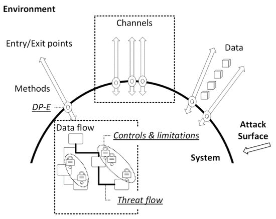 The main SPD multi-metric concepts of a system. The interaction points are located at the boundaries of the system’s surface. Controls are placed along the dataflow to protect the system. The damage potential-effort ratio (DP-E) represents the opportunity to exploit a dataflow.