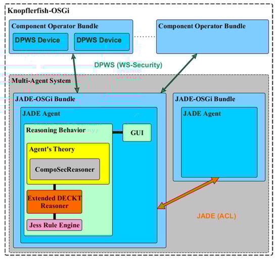 Technically, CompoSecReasoner is developed as the reasoning behavior of Java Agent DEvelopment framework (JADE) [15] agents and deployed in the middleware platform Open Services Gateway initiative (OSGi) [16]. The IoT devices implement OSGi bundles, which communicate information with the JADE bundles, and describe their provided services in DPWS [17]. The implementation is installed in a smart home application to assess and administrate the underlying smart devices with ambient intelligence capabilities for assisting living.