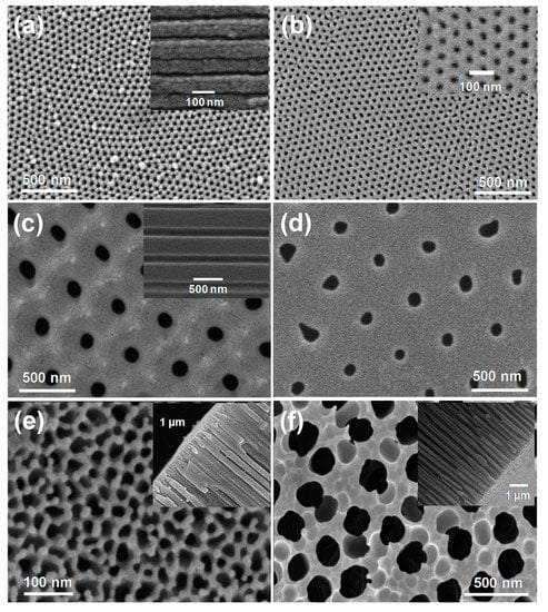 - Nielsch, K.; Choi, J.; Schwirn, K.; Wehrspohn, R.B.; Gösele, U. Self-ordering regimes of porous alumina: The 10% porosity rule. Nano Lett. 2002, 2, 677–680. [Google Scholar] [CrossRef]