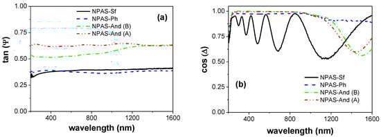 Wavelength dependence of (a) tan(Ψ) and (b) cos(Δ) experimental values for samples: NPAS-Sf (black dense line), NPAS-Ph (blue dashed line), NPAS-And surface A (green dashed-dotted line), and NPAS-And surface B (red dashed-dotted-dotted line).