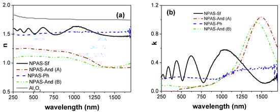 In the case of the extinction coefficient, k, curve shapes and values seem to depend on both pore size and optical region. Its average value, <k>, in the visible region for samples NPAS-Ph, NPAS-And(A), and NPAS-And(B) were 0.18 ± 0.02, 0.08 ± 0.01, and 0.06 ± 0.04, respectively; this value slightly increases to <k> = 0.26 ± 0.08 for sample NPAS-Ph in the NIR region. However, the NPAS-Sf sample exhibits oscillating behavior for the whole range of wavelengths, while values obtained for both sides of the NPAS-And in the NIR region also show similar tendencies, which would indicate the higher influence of lower pore size in that optical region.