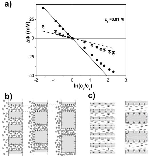 Figure 5 shows the variation of ΔΦ values with NaCl concentration ratio (cv/cc = cv/0.01) for the three analyzed NPASs, and differences depending on the sample can be observed. For comparison reasons, diffusion potential values for the NaCl solution (due to the different transport number of Na+ and Cl− in solution (without NPAS), that is, tNa+o and tCl−o, respectively) and those for an ideal anion-exchange structure (positively charged, with total cation (co-ions) exclusion, tNa+ = 0 and tCl− = 1 into the pores) are also indicated in Figure 5a by a dashed line and a solid line, respectively. Values in Figure 5a clearly show differences in ΔΦ values associated to both pore size and sample asymmetry. The effects of ions distribution in charged nanoporous structures as a function of pore size, porosity, or charge are schematically shown in Figure 5b,c.