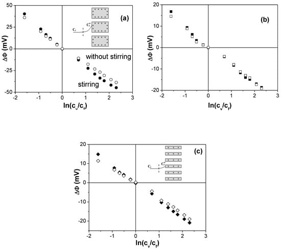 The influence of pore radii and porosity on interfacial effects and diffusive transport have already been analyzed in a previous paper [], and it is schematically shown in the Supplementary Information in Figure S2b. The partial exclusion of co-ions from nanopores due to electrical interactions causes an increase of solution concentration at the solid–liquid interfaces (concentration polarization), which can be minimized by solutions stirring; consequently, a comparison of ΔΦ values obtained for the same external solution concentrations under stirring and no-stirring conditions might give information on interfacial effects. Figure 6 shows a comparison of ΔΦ values determined for the NPASs under both experimental conditions, where slight differences depending on sample structure can be observed. Reductions of around 17% and 10% in ΔΦ values at a high NaCl solution concentration (cv > 0.03 M) were obtained for NPAS-Sf and NPAS-And samples, respectively, as a result of concentration-polarization, but no differences seemed to exist at the solution/NPAS-Ph interfaces due to its larger pore size.